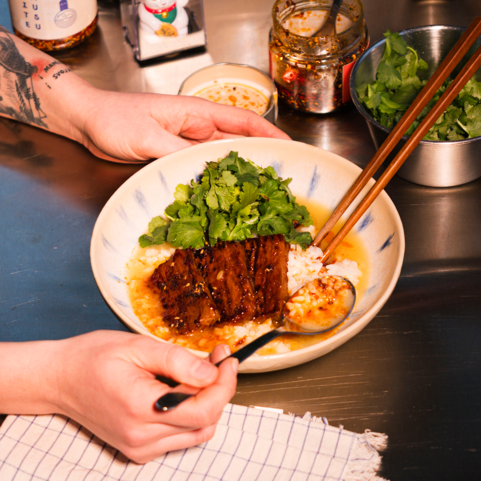 WITH MARBLES, CHILI OIL AND VEGETABLES
