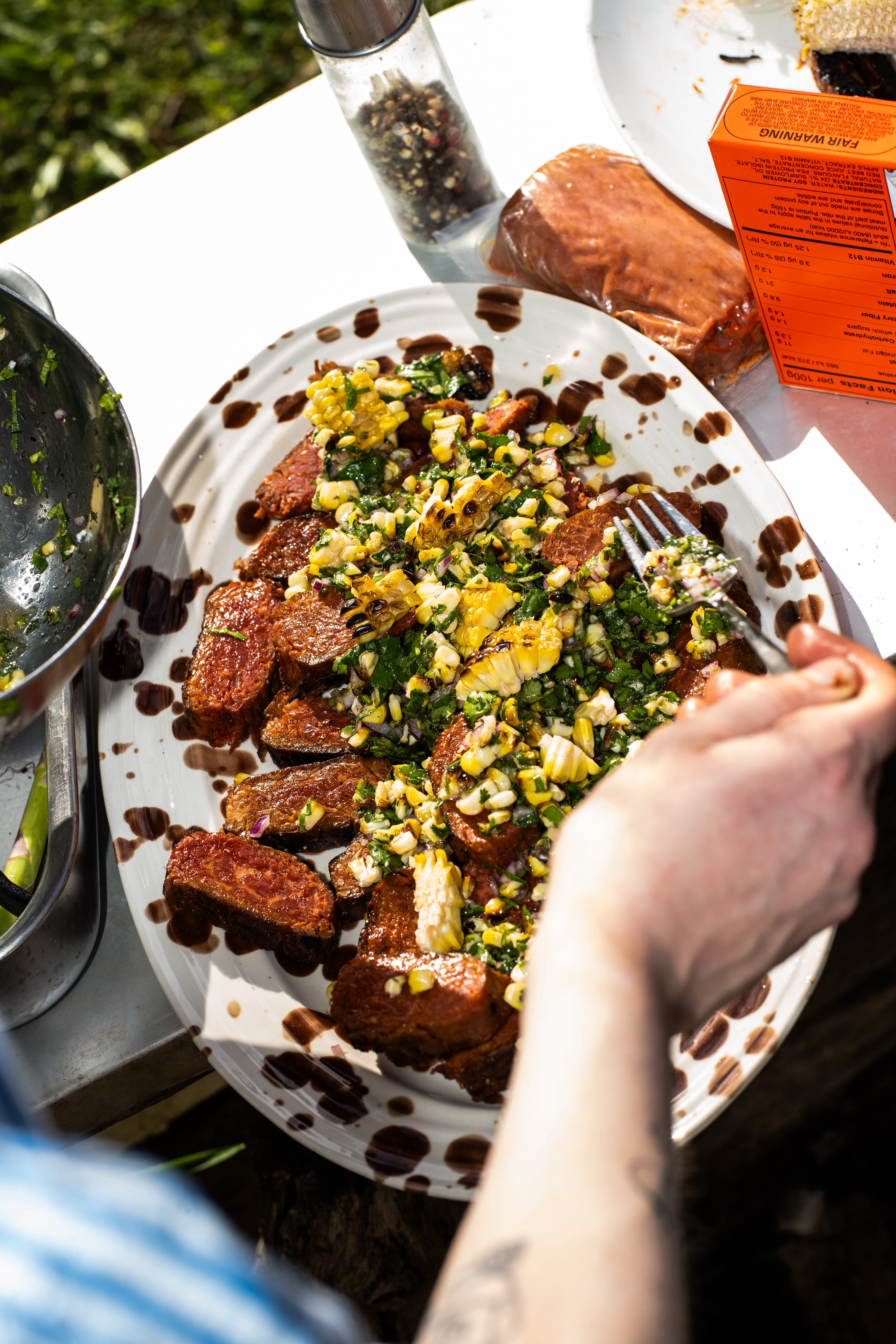 Meaty Meat with Charred Corn and Coriander Salsa