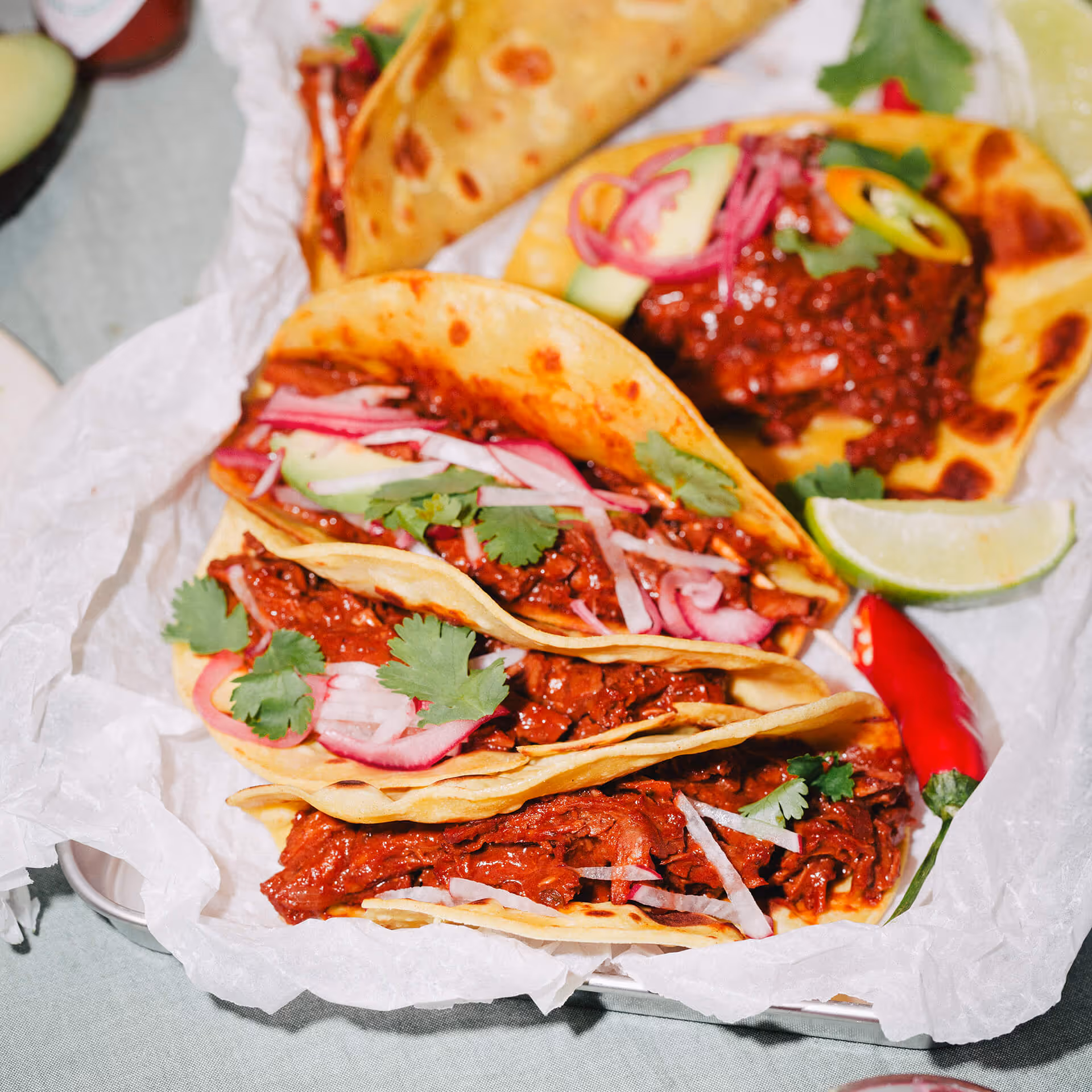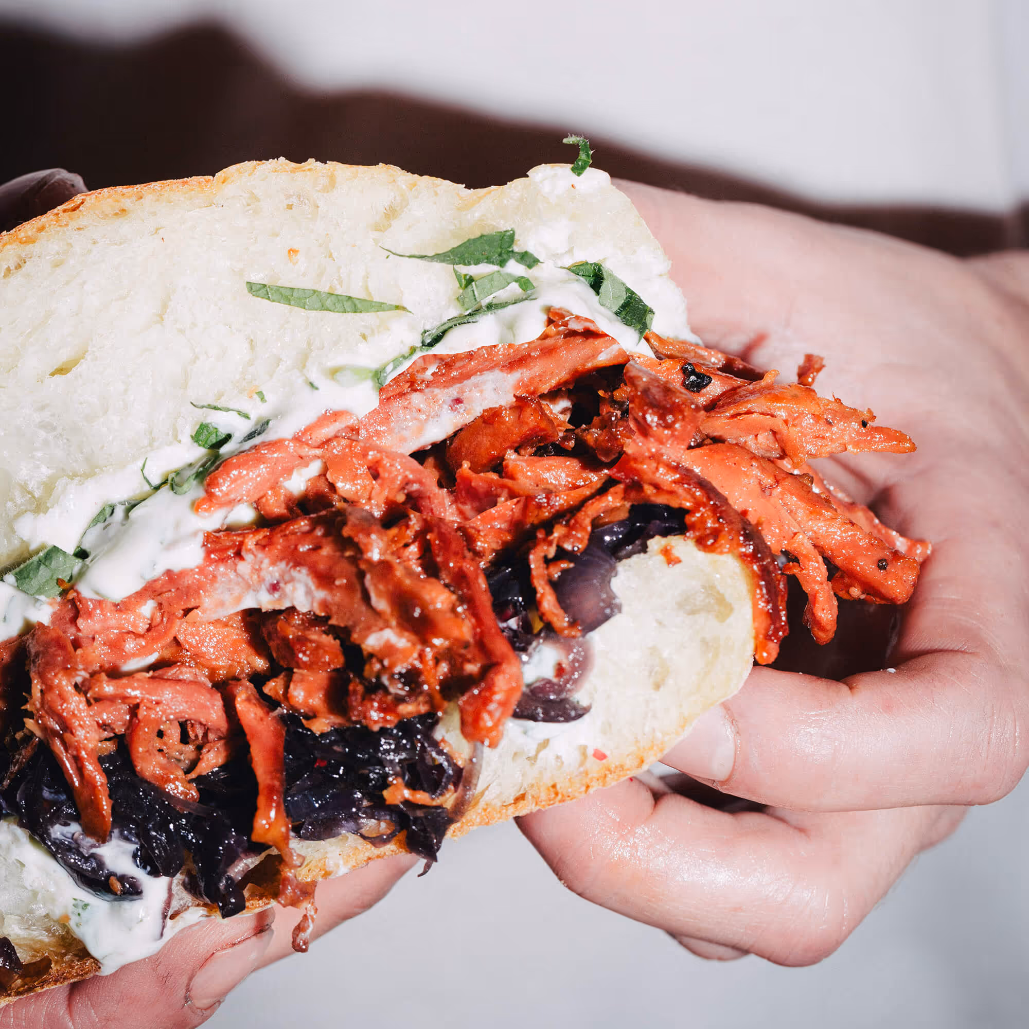 WITH PULLED MEATY MEAT, SPICY MAYO, AND QUICK-PICKLED VEGETABLES