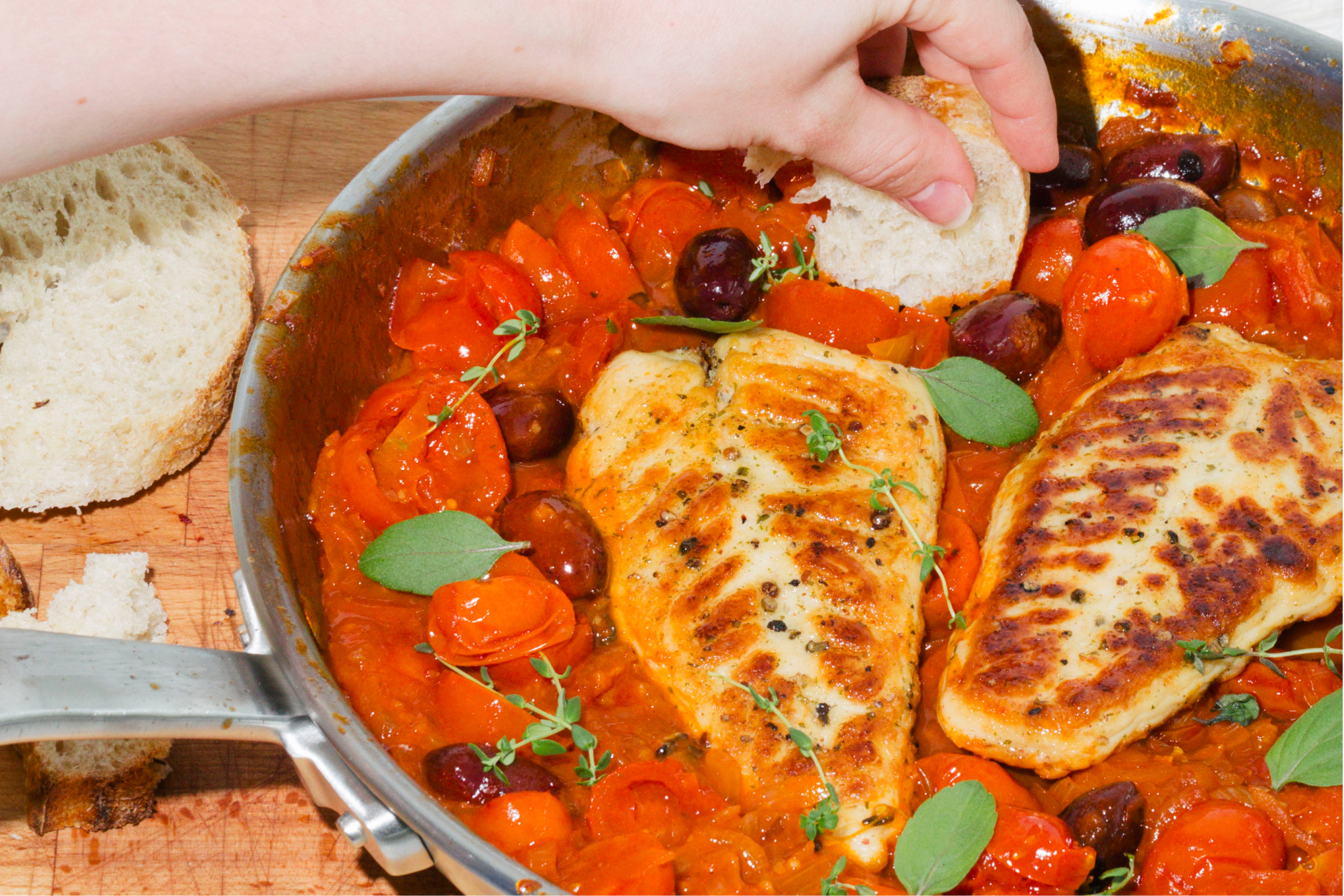 It seems like every year after you turn 20, someone’s jetting off to Italy or Japan. Meanwhile, I remain in place, all grown up and trying to save money so as not to die in this cupboard apartment I currently call home. So yeah—big internash travel is off the table. But to fight the FOMO and still do some soul-searching, I practice taste bud travel. Southeast Asia, Mexico, Denmark, you name it, I’ve probably been there (in my mind’s tummy, at least). And this aromatic, passion-coloured dish? It transports me straight to the coast of Italy on a hot summer evening. I’m talking tomatoes mingling with garlic, slowly bubbling away in a sea of white wine, laced with sprigs of fresh thyme and basil. Paired with a flaky, plant-based white fish, this meal is the perfect Mediterranean bread dunking dalliance. But you can also involve creamy polenta or chewy pasta. Your call. It's your vacation.
