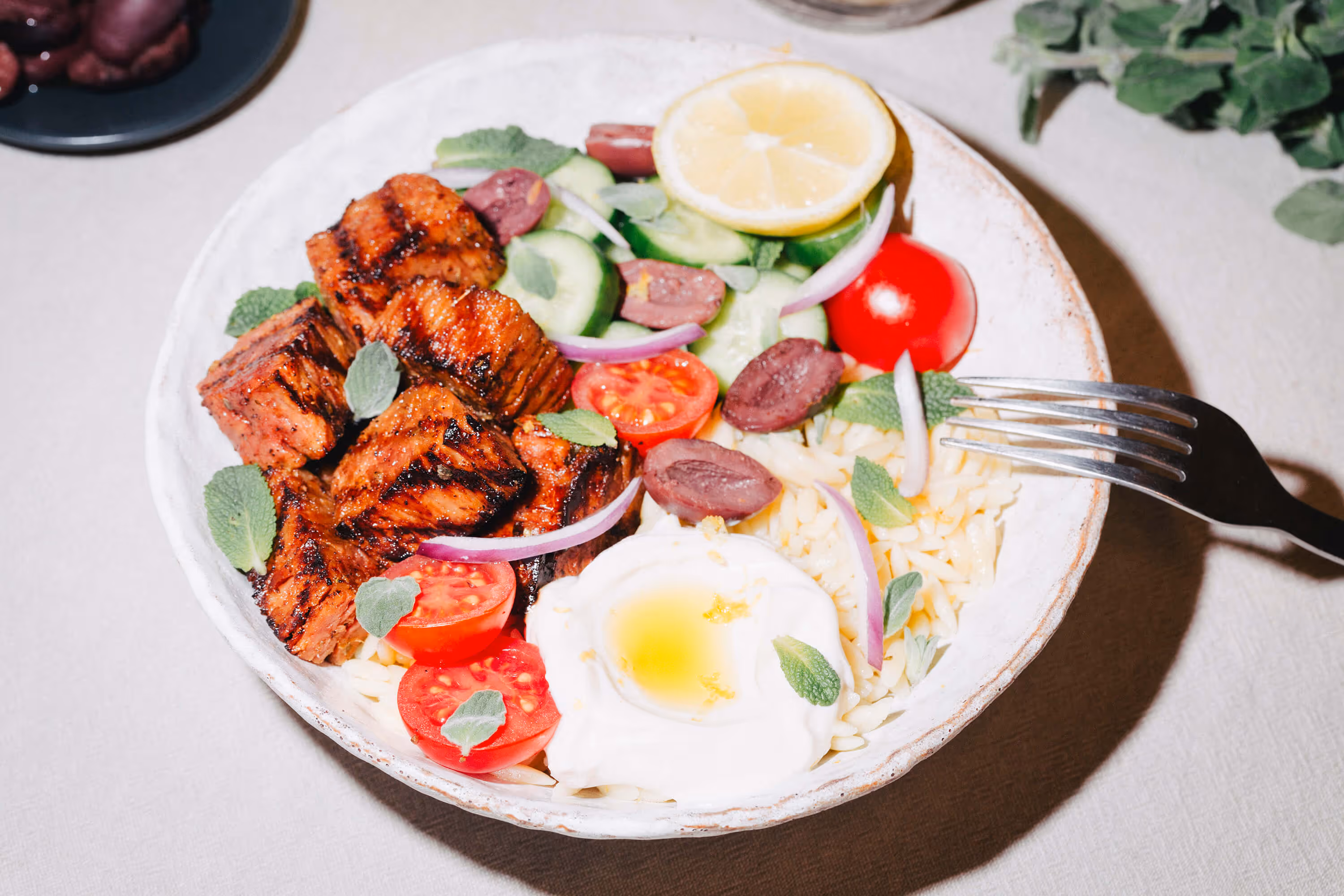 2. Top with cucumber slices, cherry tomato halves, Kalamata olives, and Meaty Meat chunks.