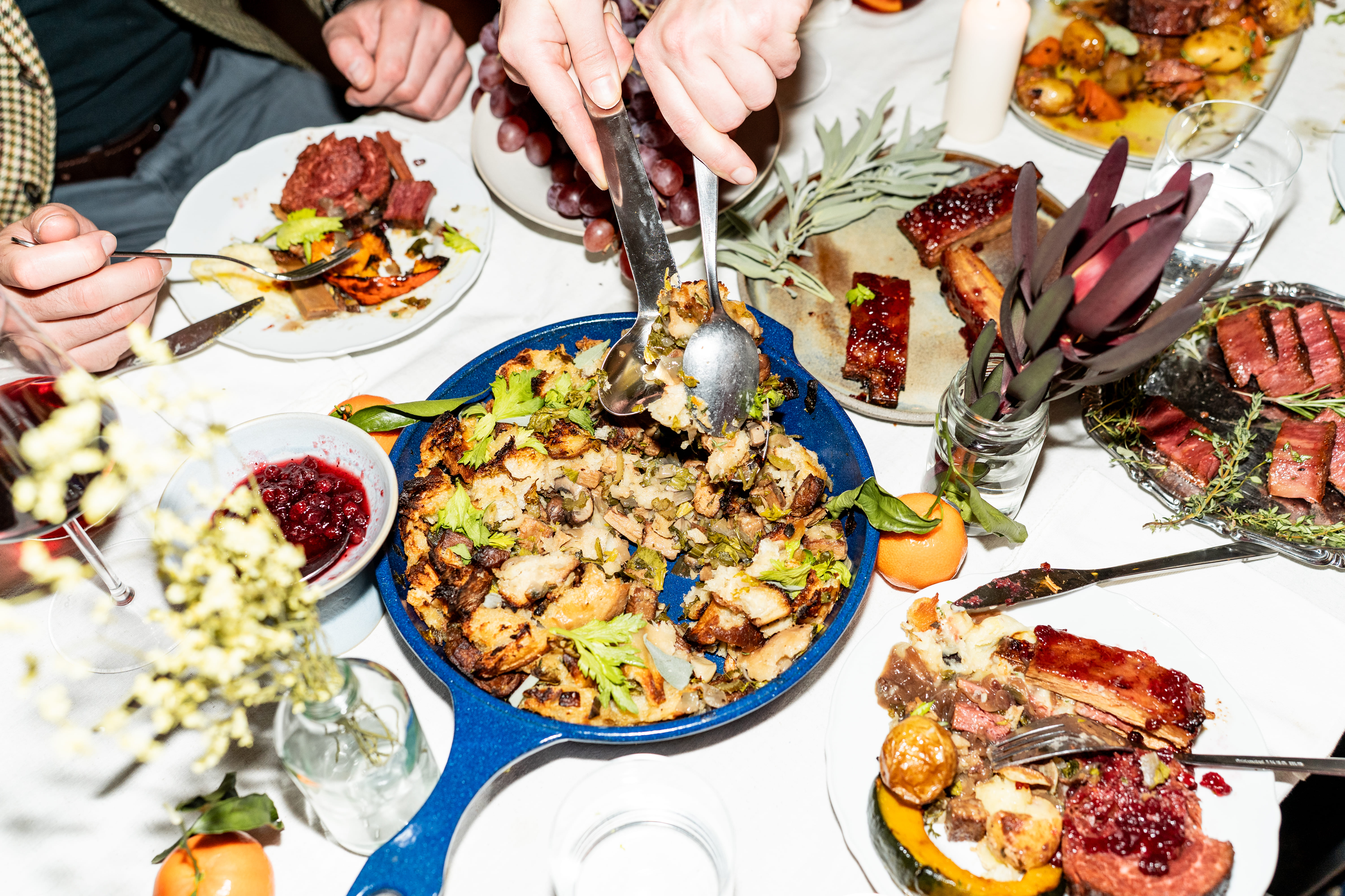 Stuffing as a concept sounds weird. You take fresh bread, dry it out, wet it again, and dry it out once more. But the finished dish, well, that’s pure magic. What sounds like a sensory nightmare to some is the epitome of coziness and holidays for me. The bread soaks up the flavorful stock and white wine, turning into savory perfection with crispy edges (objectively, the best part). Because I take my job very seriously, I consulted our American Marble Magnus about all things stuffing. To my shock, he informed me that stuffing was originally baked inside the turkey and then scooped out (explains the name, I guess). But I am a simple woman, so I decided against stuffing our Whole-Cut Loin like a turkey. Instead, I took the meat that is usually around the stuffing and put it in the stuffing. So, reverse stuffing. Heresy, I know, but it worked like magic, and I encourage you to follow my sinful example.