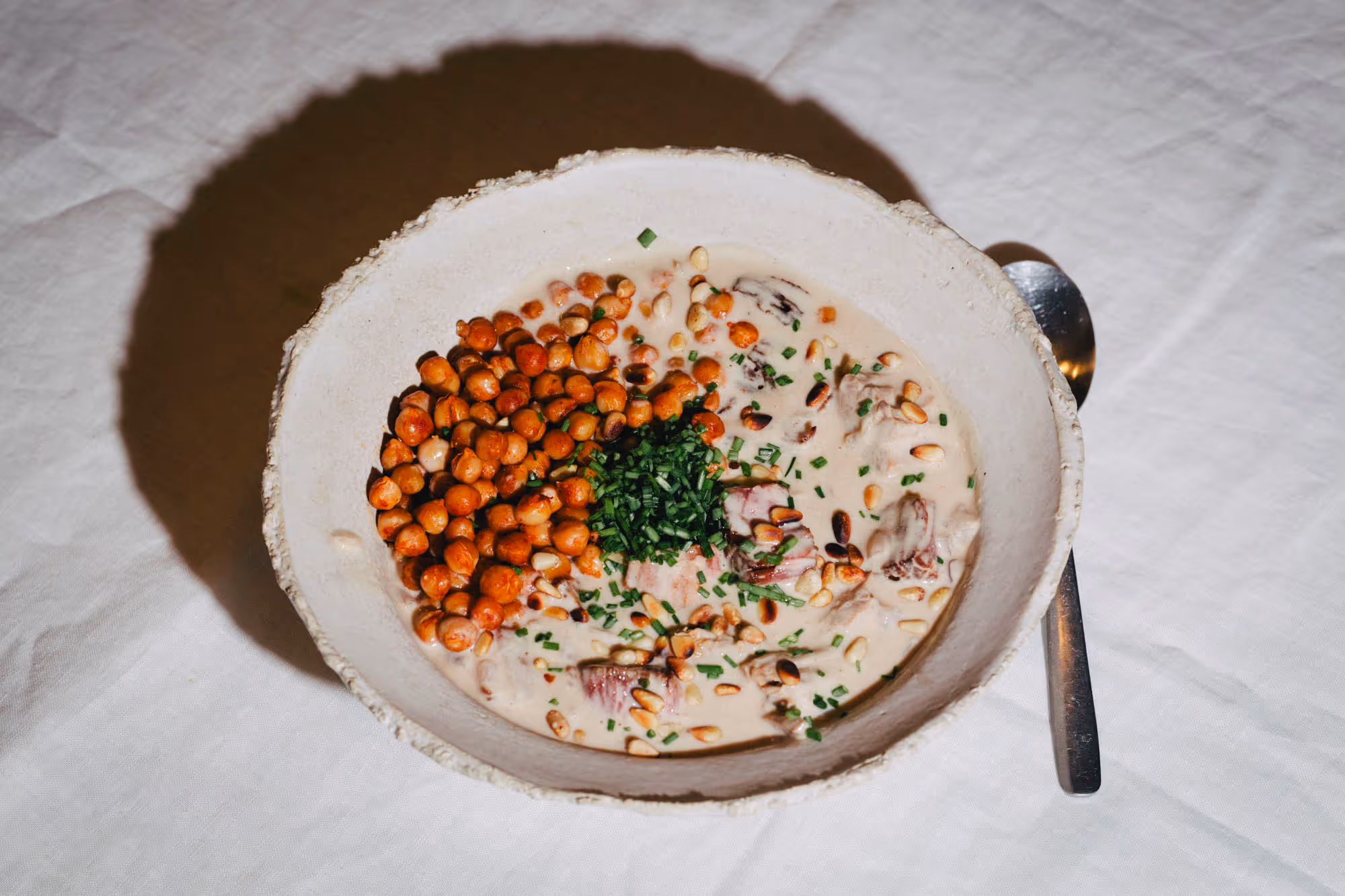 3. Add the yogurt and chickpeas to the meat and broth, and mix until fully combined. Serve immediately! Top with dried mint, pepper, pine nuts, and a side of rice or toasted pita bread. <3