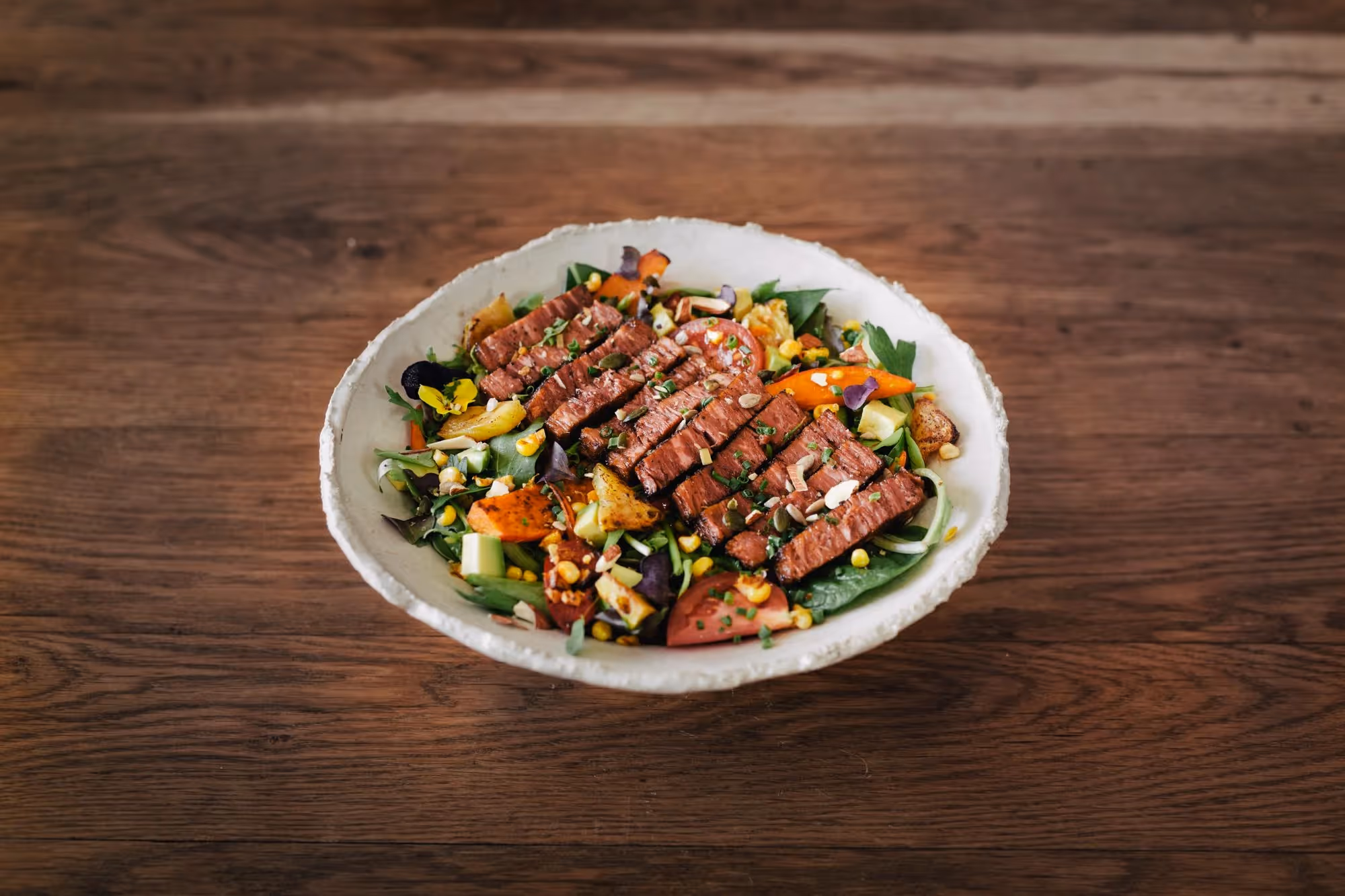 1. Take your roasted pineapple and cut it into bite sized pieces, then add it to the salad. Take your sautéed veggies and add them to your bowl. Then take your steak strips and add them to the bowl. Top with roasted nuts and seeds. Mix it all together, adjust the salt and pepper to your taste.